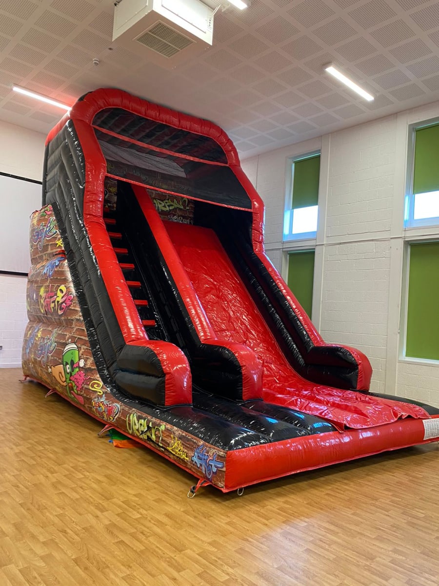 Add some incredible party fun to your event with our Graffiti Mega Slide! With its striking black and red design, and adorned with graffiti-style artwork, this inflatable slide promises to be the centrepiece of any event.